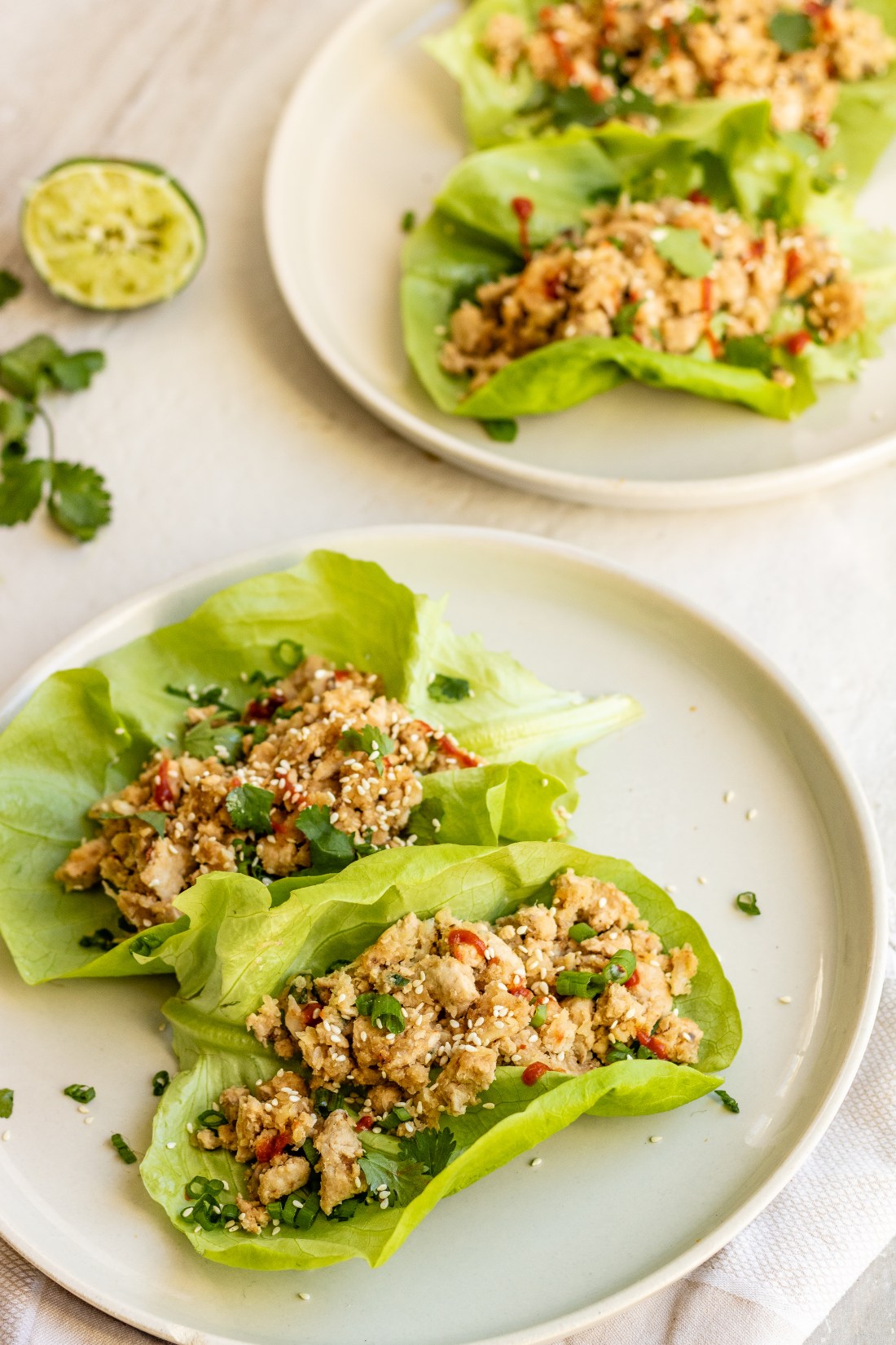 Inspired in part by a Chrissy Teigen’s recipe for chicken lettuce wraps, I thought this recipe would be even better with the addition of my Cauliflower fried “rice” – and not to mention – make it go a little further! This is one of my absolute favourite meals for a weeknight dinner and is oh so fresh & satisfying!
