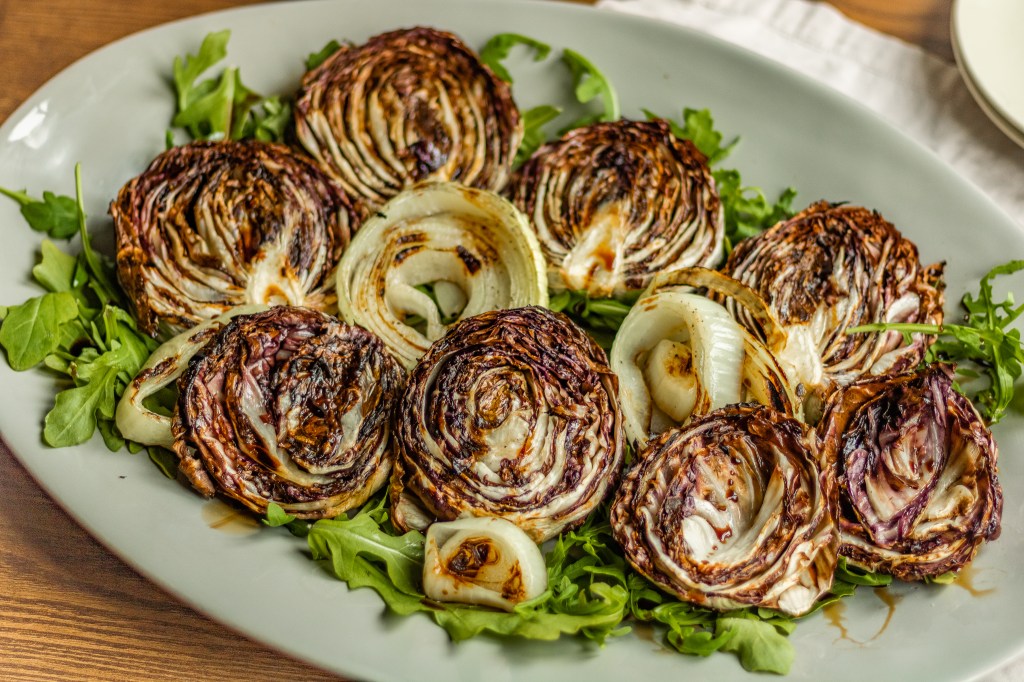 - On a serving dish, arrange the arugula, radicchio and onions. Drizzle with remaining olive oil, balsamic glaze and season with salt and pepper. Top with bratwurst and enjoy!