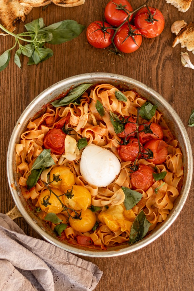 - Add remaining olive oil to the now empty pan and heat over medium heat. Squeeze out roasted garlic and using a back of a spoon, smash them slightly, mixing with the oil. Add tomato paste, red pepper flakes and pasta water. Simmer for about 5 minutes then add noodles, cooking for about another 5 minutes. Season with salt and pepper and add the roasted tomatoes to the pan (you can keep the stems on or remove at this point).