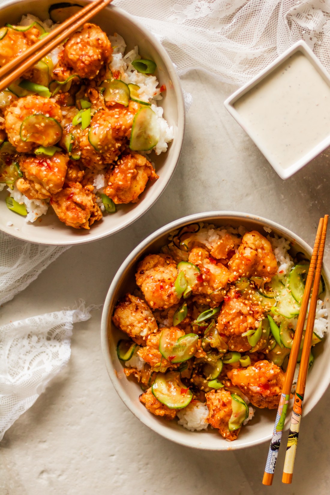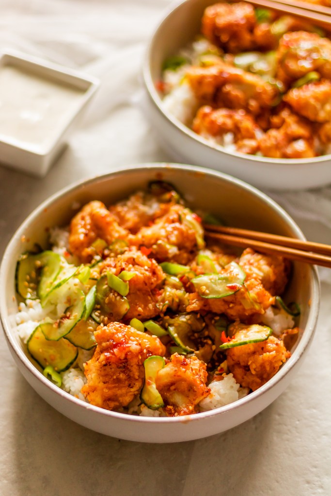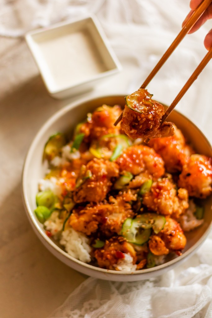 I like to my Chilli Chicken with a ton of cucumbers and a heaping scoop of steamy coconut rice. I’d say this recipe is relatively easy, aside from the frying itself. I RARELY fry any food, so it’s not something I really love to do and find it quite stressful if I’m perfectly honest. But since I was going for the Earls taste here – frying was the only way to achieve that restaurant-quality taste.