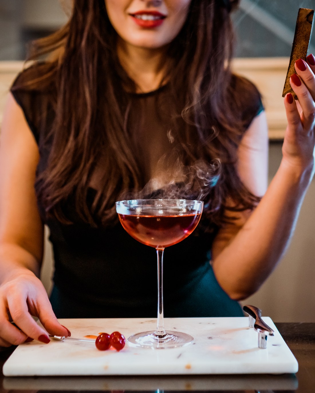 - Light up the cedar plank again using a torch and once it’s got a good flame going – place over the glass and let it fill with smoke for another 2 mins. Remove plank and serve immediately with a cherry garnish.