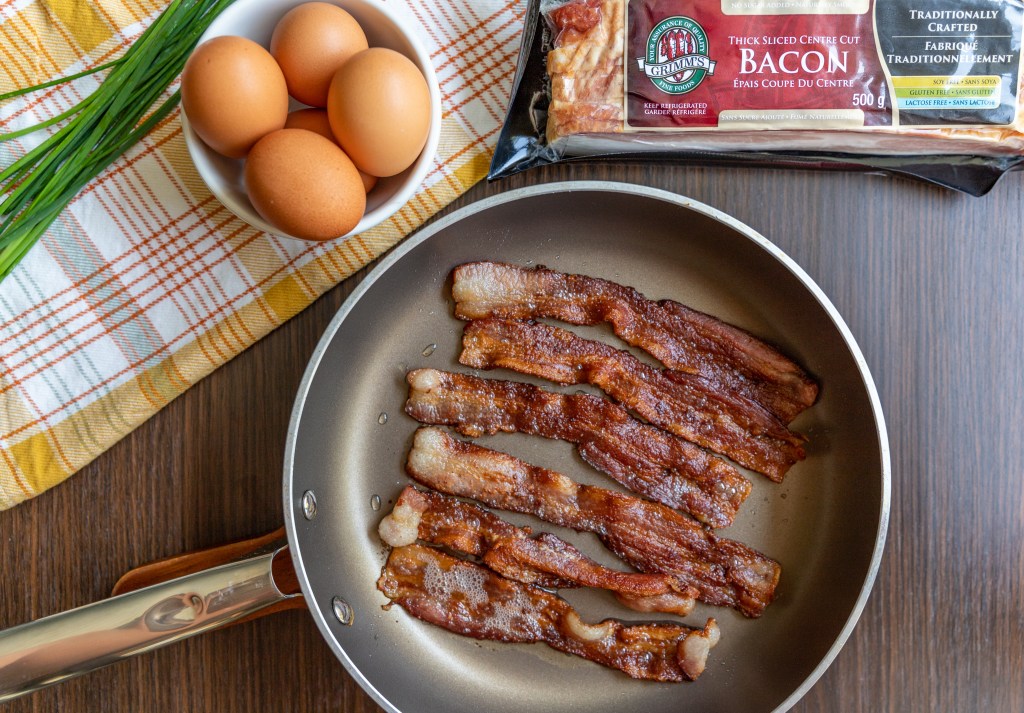 - Preheat a sauté pan over medium high-heat. Cook the Grimm’s bacon, flipping 1-2 times, until crispy. Place on a paper towel to absorb the grease then chop into bite size pieces. Set aside.