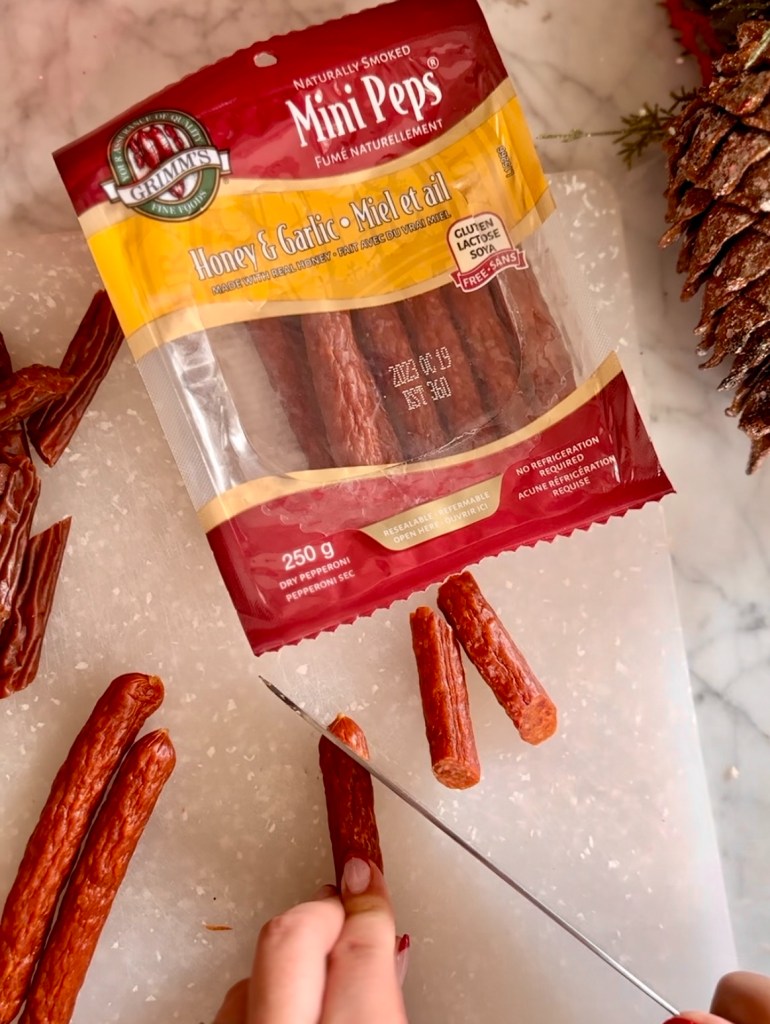 • 8 Grimm’s Mini Peps, sliced in half (I did a combo of honey garlic and lean turkey for some depth in colour)