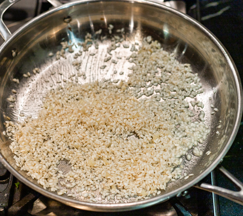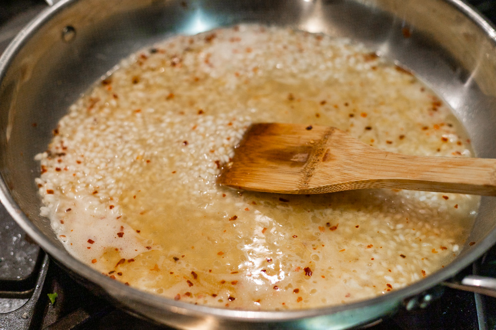 - Next add arborio rice, stirring until translucent and coated with butter, about 1 more minute. Add the wine and chili flakes while constantly stirring until rice absorbs all of wine.